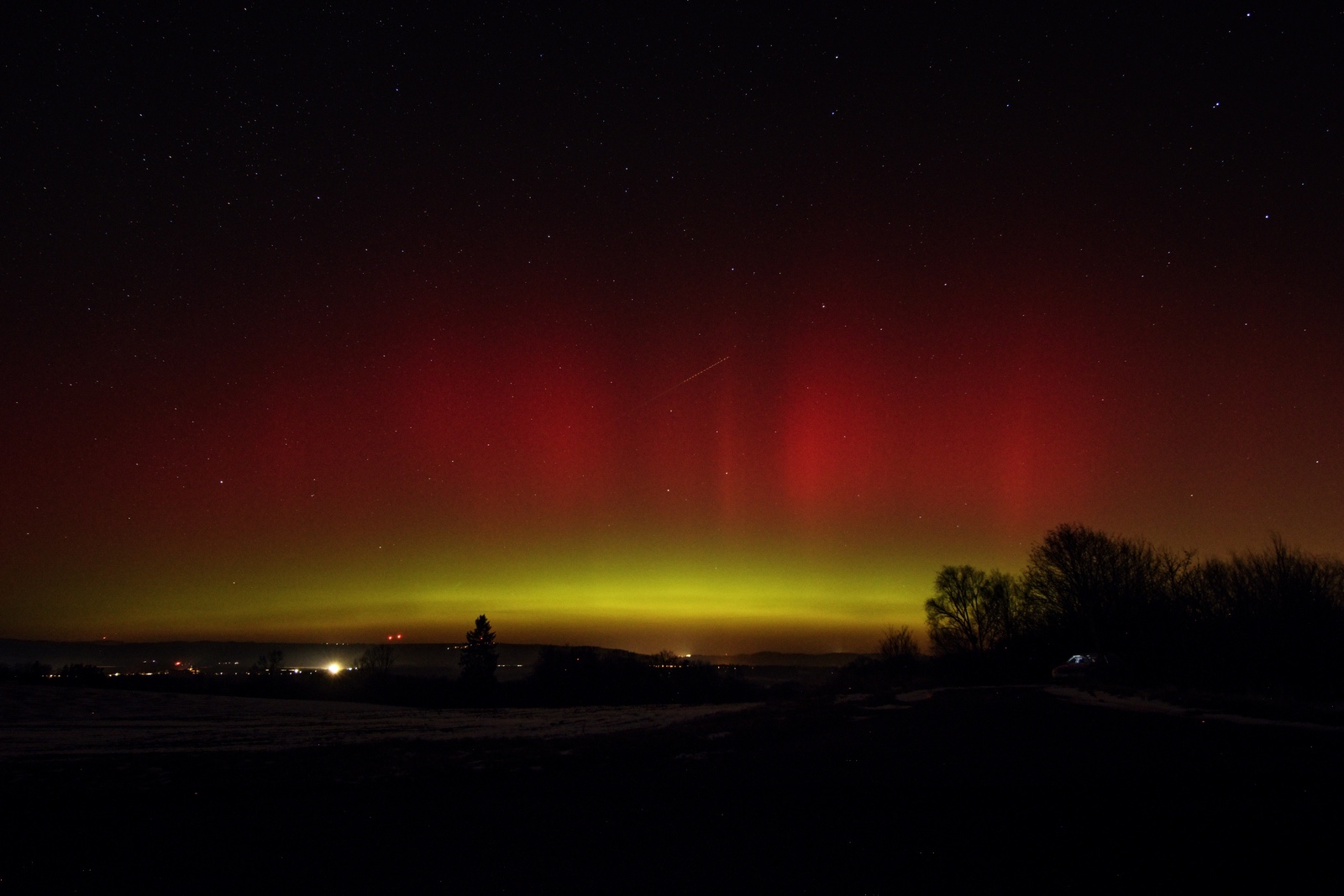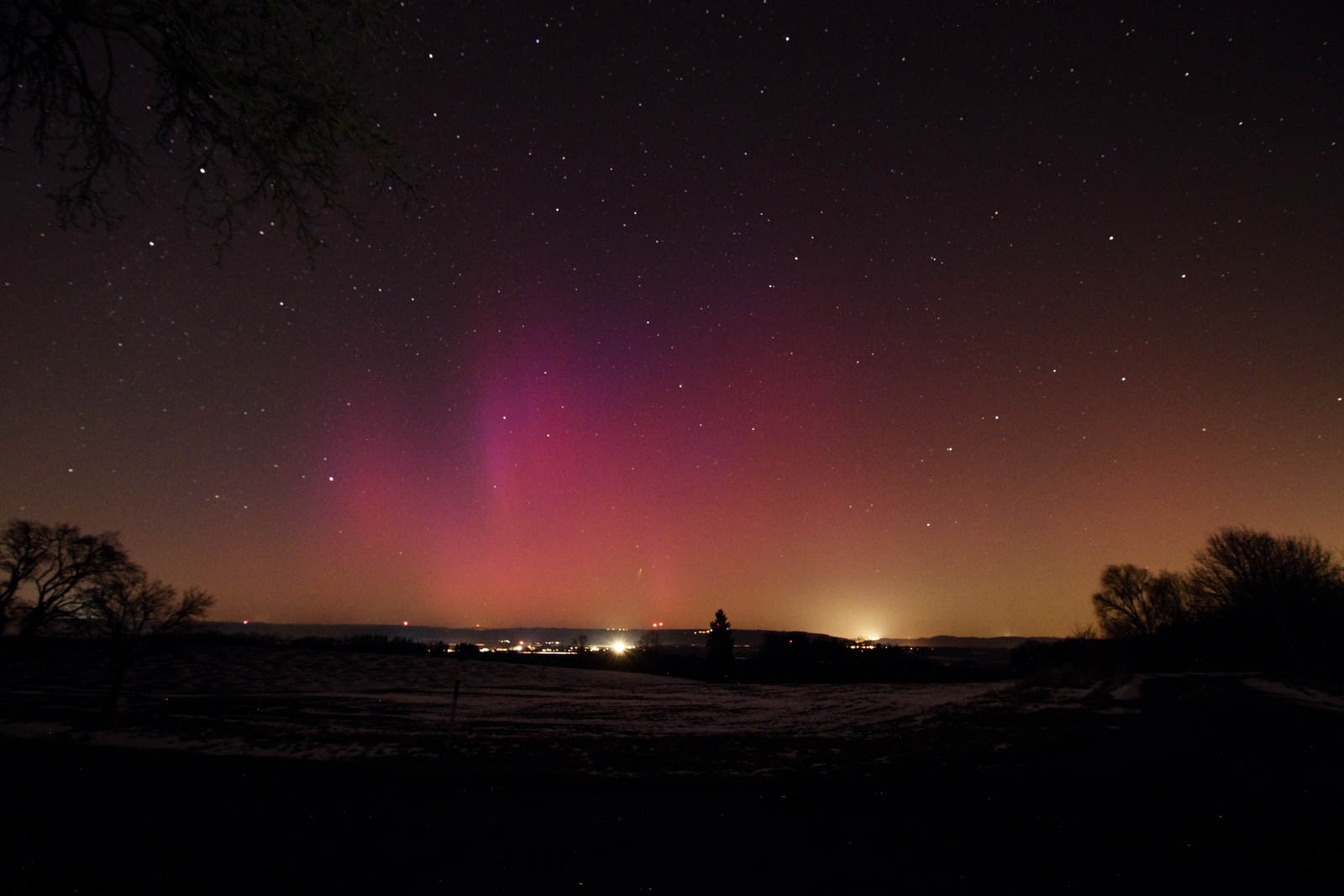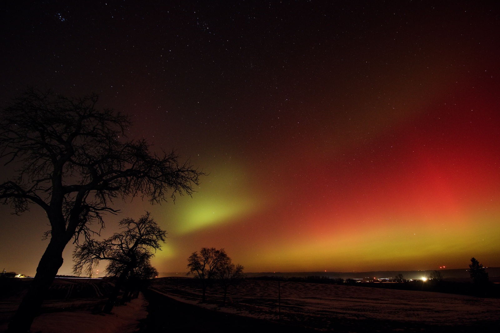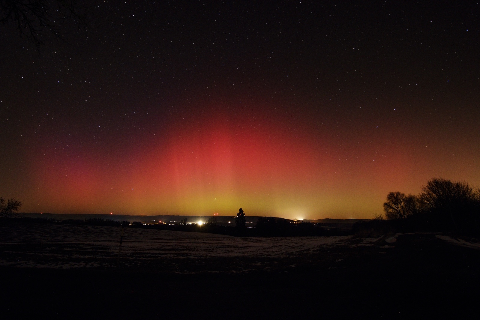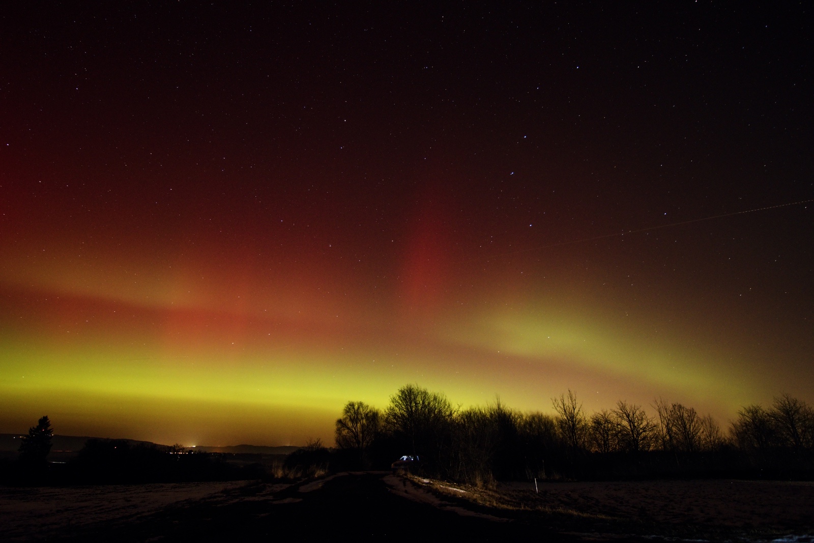 Když mi někdy kolem desáté večer zazvonil telefon a na něm Honza, divil jsem se, kvůli čemu může v tenhle nudný zimní den volat. Jak to řekl, chvíli jsem se zmateně divil, pak pokládám telefon a následovalo nejprve nějakých 10 minut stresu a nervů. Všechno rychle pobalit, dobře se obléknout, a rychle se dopravit na nějaké místo, odkud je vidět na sever. Jenže kolo mám píchlé, auto mělo zase zamrzlé okno zvenku i zevnitř. No nějak jsem dojel na své nové pozorovací místo, odkud jsem už před čtvrt rokem střelil svou kalendářovku. Vyškrábal jsem se po svahu, nainstaloval foťák a poprvé se podíval na oblohu. Opravdu – je tam! Obloha se ve výšce znatelně červenala a u země bylo vidět zelené světlo. Hned na to jsem se podíval na displeji. Neskutečné! Pravá polární záře – snad jako v Radostovicích.