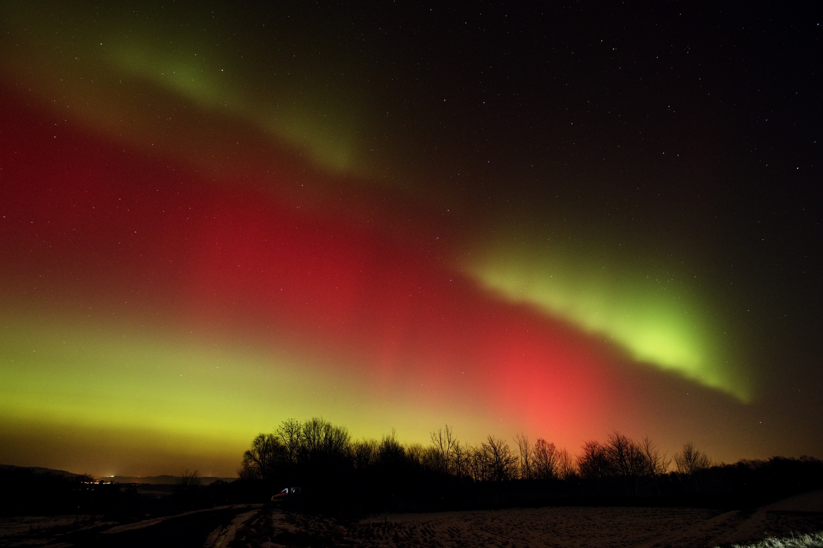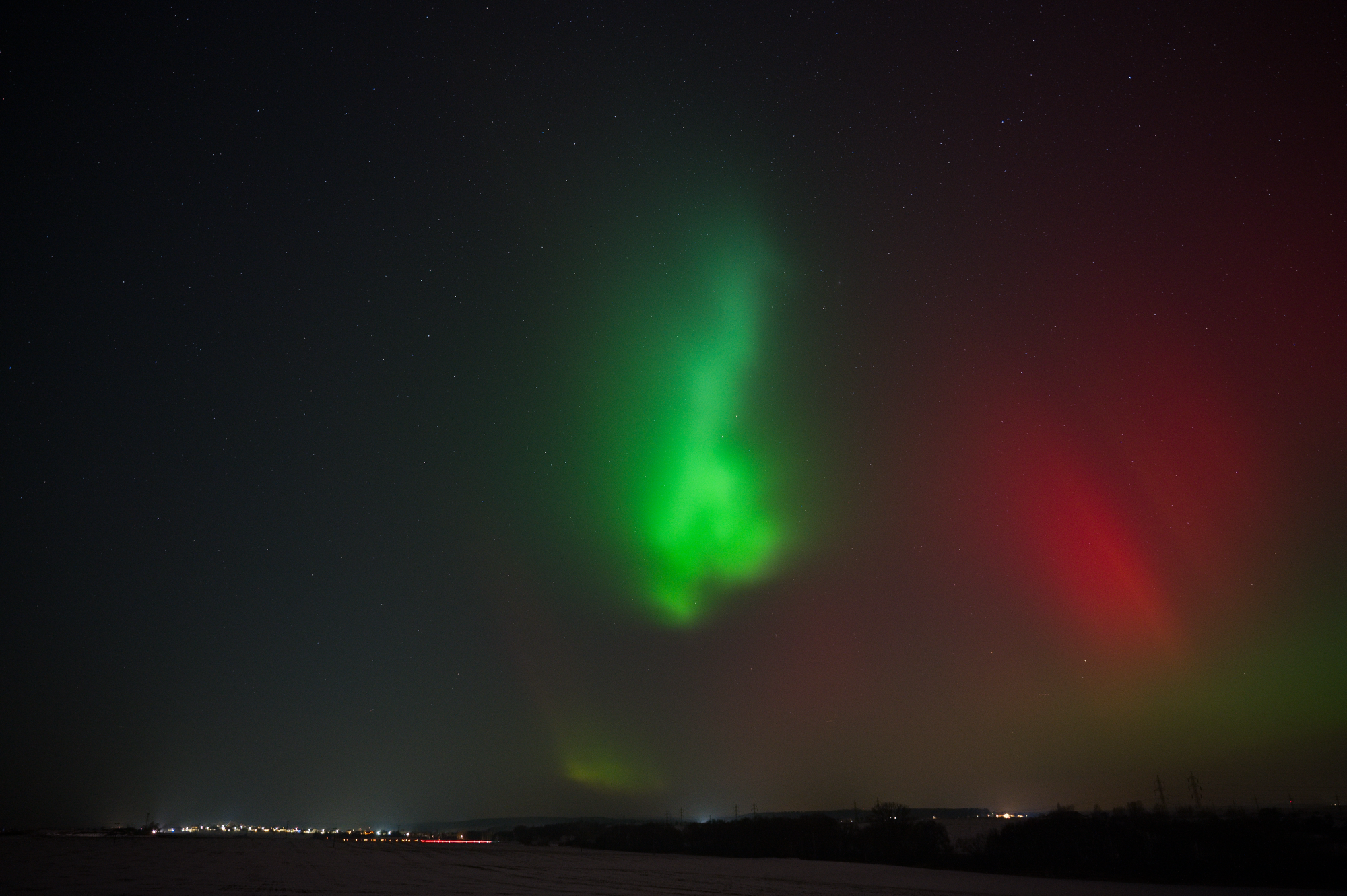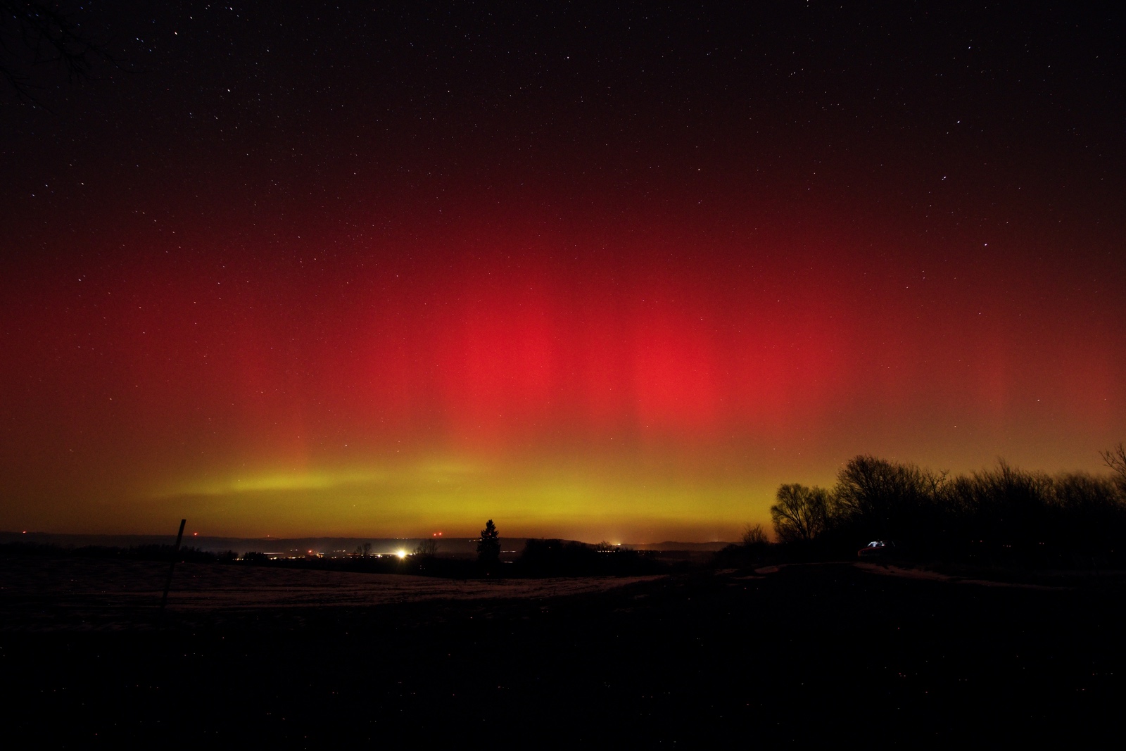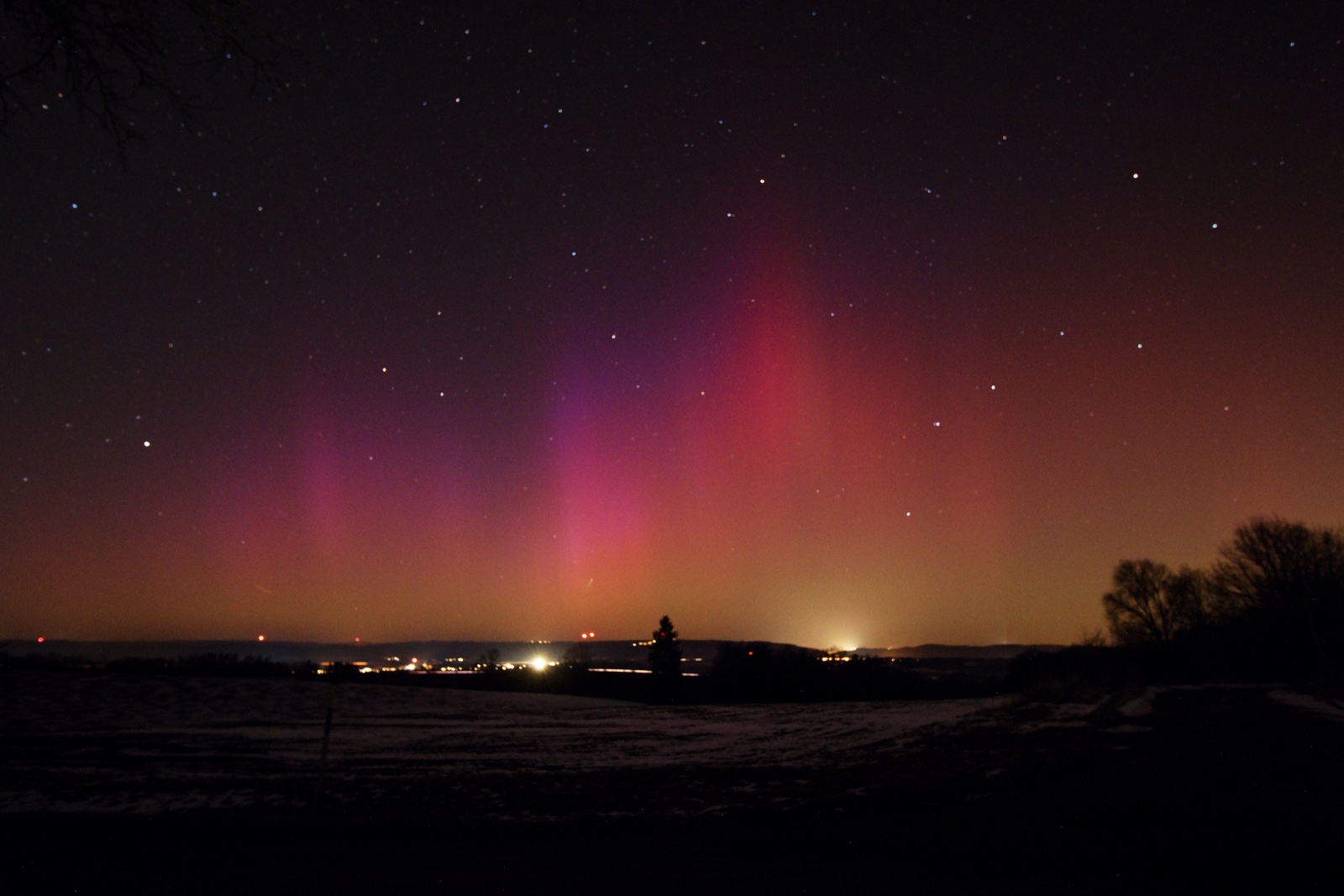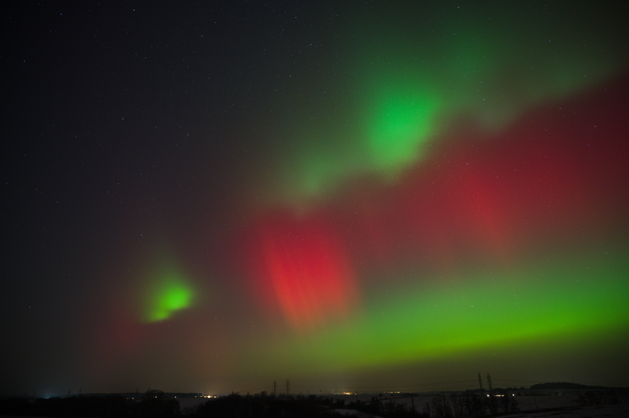 Když mi někdy kolem desáté večer zazvonil telefon a na něm Honza, divil jsem se, kvůli čemu může v tenhle nudný zimní den volat. Jak to řekl, chvíli jsem se zmateně divil, pak pokládám telefon a následovalo nejprve nějakých 10 minut stresu a nervů. Všechno rychle pobalit, dobře se obléknout, a rychle se dopravit na nějaké místo, odkud je vidět na sever. Jenže kolo mám píchlé, auto mělo zase zamrzlé okno zvenku i zevnitř. No nějak jsem dojel na své nové pozorovací místo, odkud jsem už před čtvrt rokem střelil svou kalendářovku. Vyškrábal jsem se po svahu, nainstaloval foťák a poprvé se podíval na oblohu. Opravdu – je tam! Obloha se ve výšce znatelně červenala a u země bylo vidět zelené světlo. Hned na to jsem se podíval na displeji. Neskutečné! Pravá polární záře – snad jako v Radostovicích.