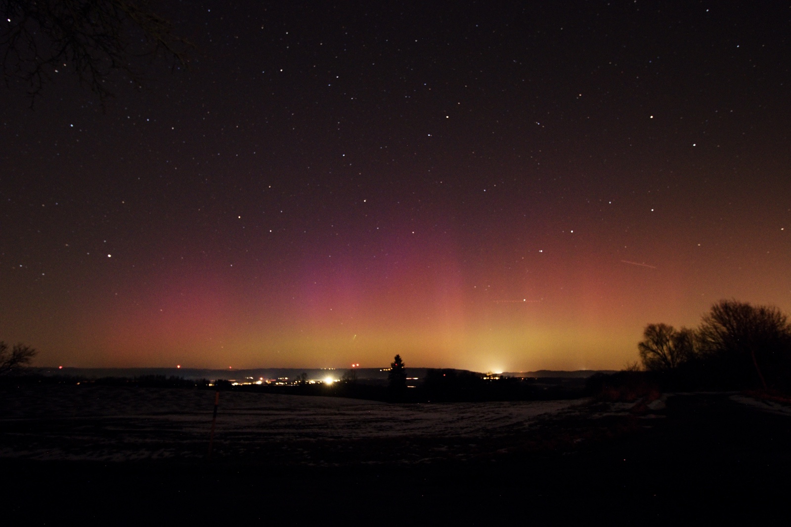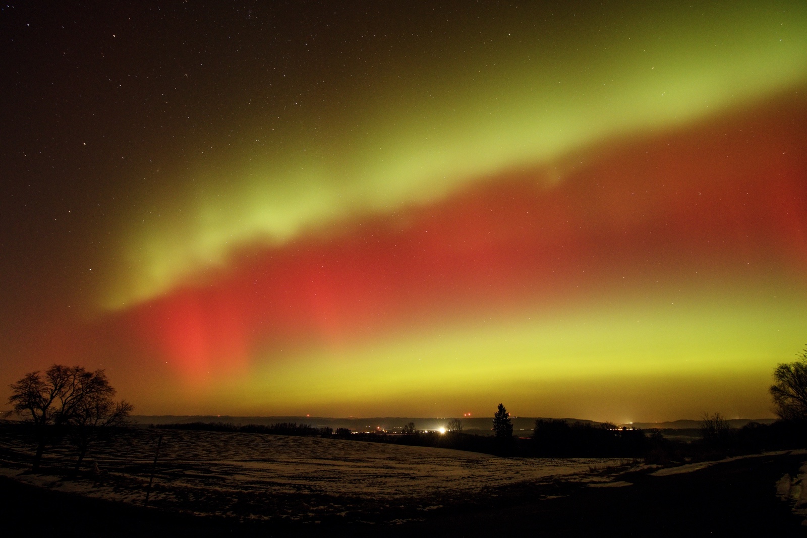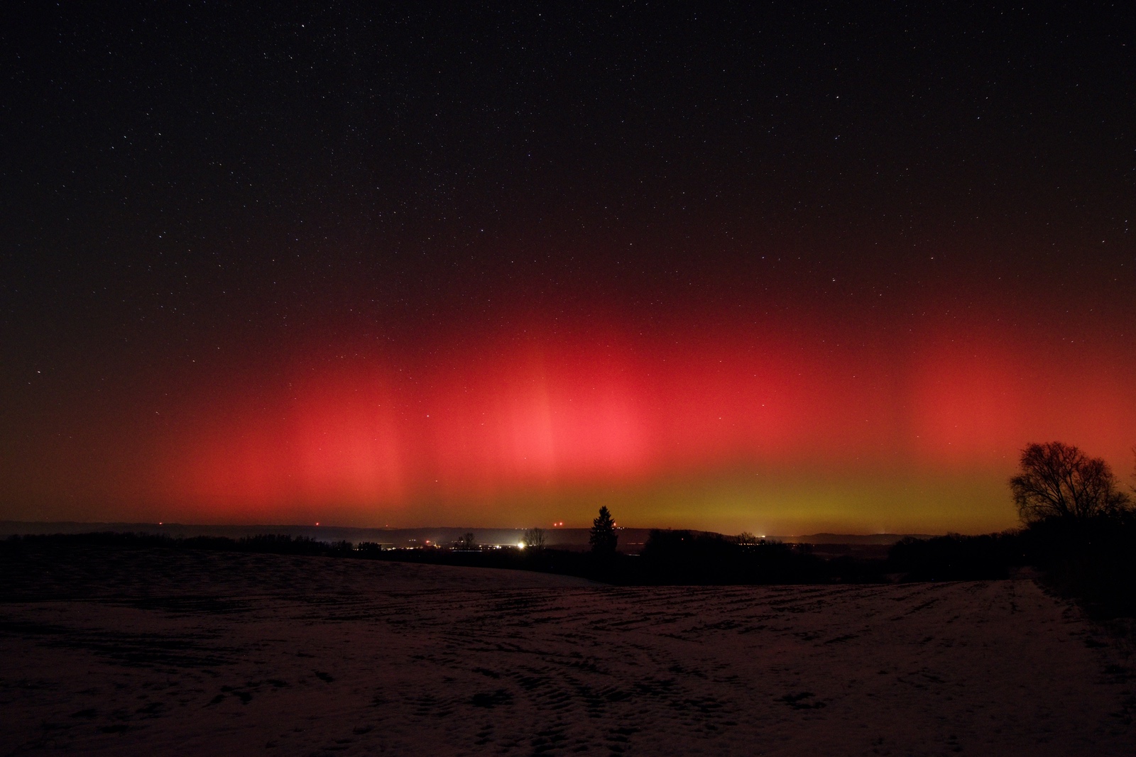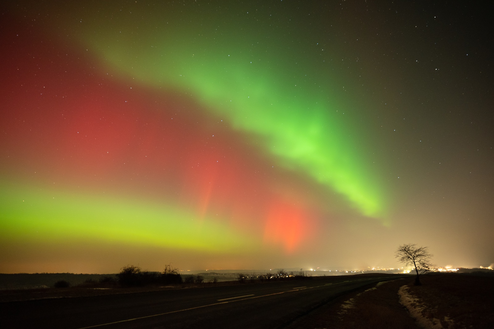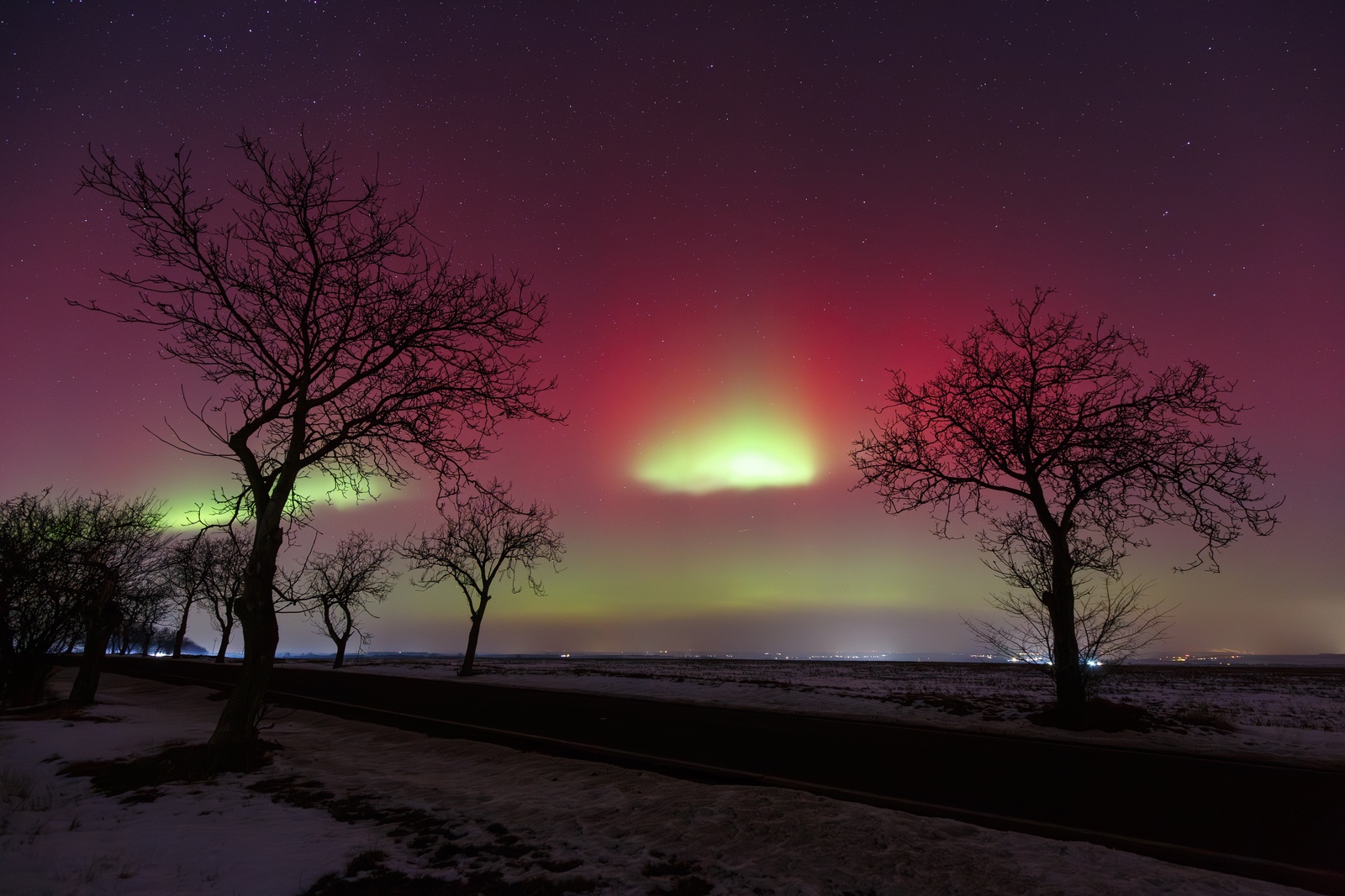 Když mi někdy kolem desáté večer zazvonil telefon a na něm Honza, divil jsem se, kvůli čemu může v tenhle nudný zimní den volat. Jak to řekl, chvíli jsem se zmateně divil, pak pokládám telefon a následovalo nejprve nějakých 10 minut stresu a nervů. Všechno rychle pobalit, dobře se obléknout, a rychle se dopravit na nějaké místo, odkud je vidět na sever. Jenže kolo mám píchlé, auto mělo zase zamrzlé okno zvenku i zevnitř. No nějak jsem dojel na své nové pozorovací místo, odkud jsem už před čtvrt rokem střelil svou kalendářovku. Vyškrábal jsem se po svahu, nainstaloval foťák a poprvé se podíval na oblohu. Opravdu – je tam! Obloha se ve výšce znatelně červenala a u země bylo vidět zelené světlo. Hned na to jsem se podíval na displeji. Neskutečné! Pravá polární záře – snad jako v Radostovicích.