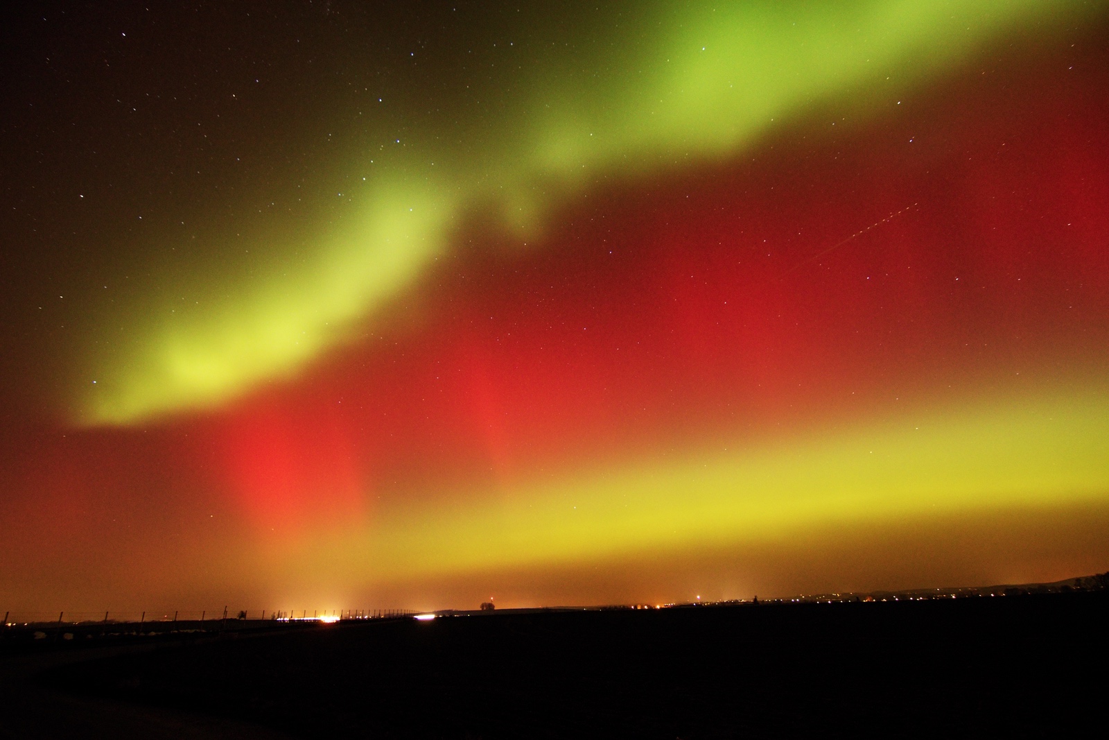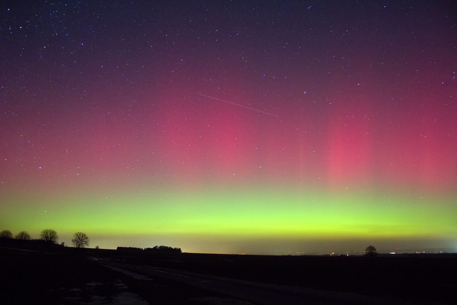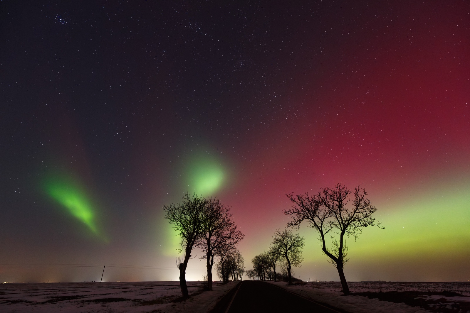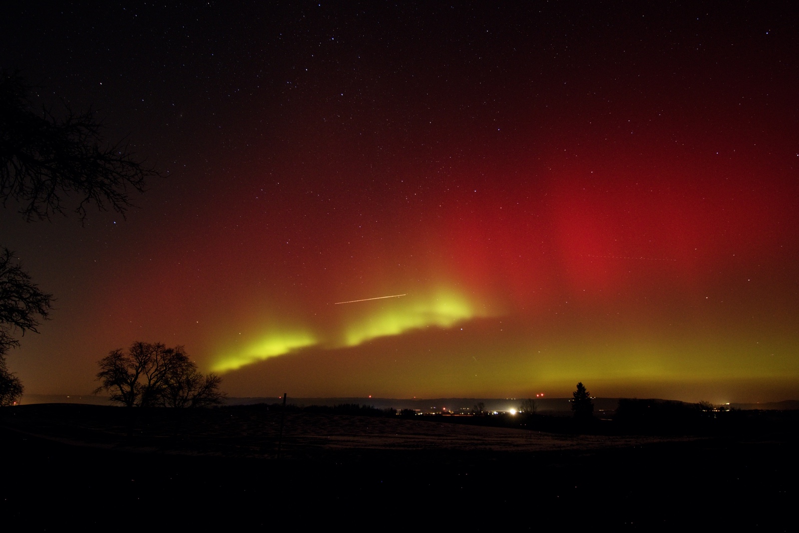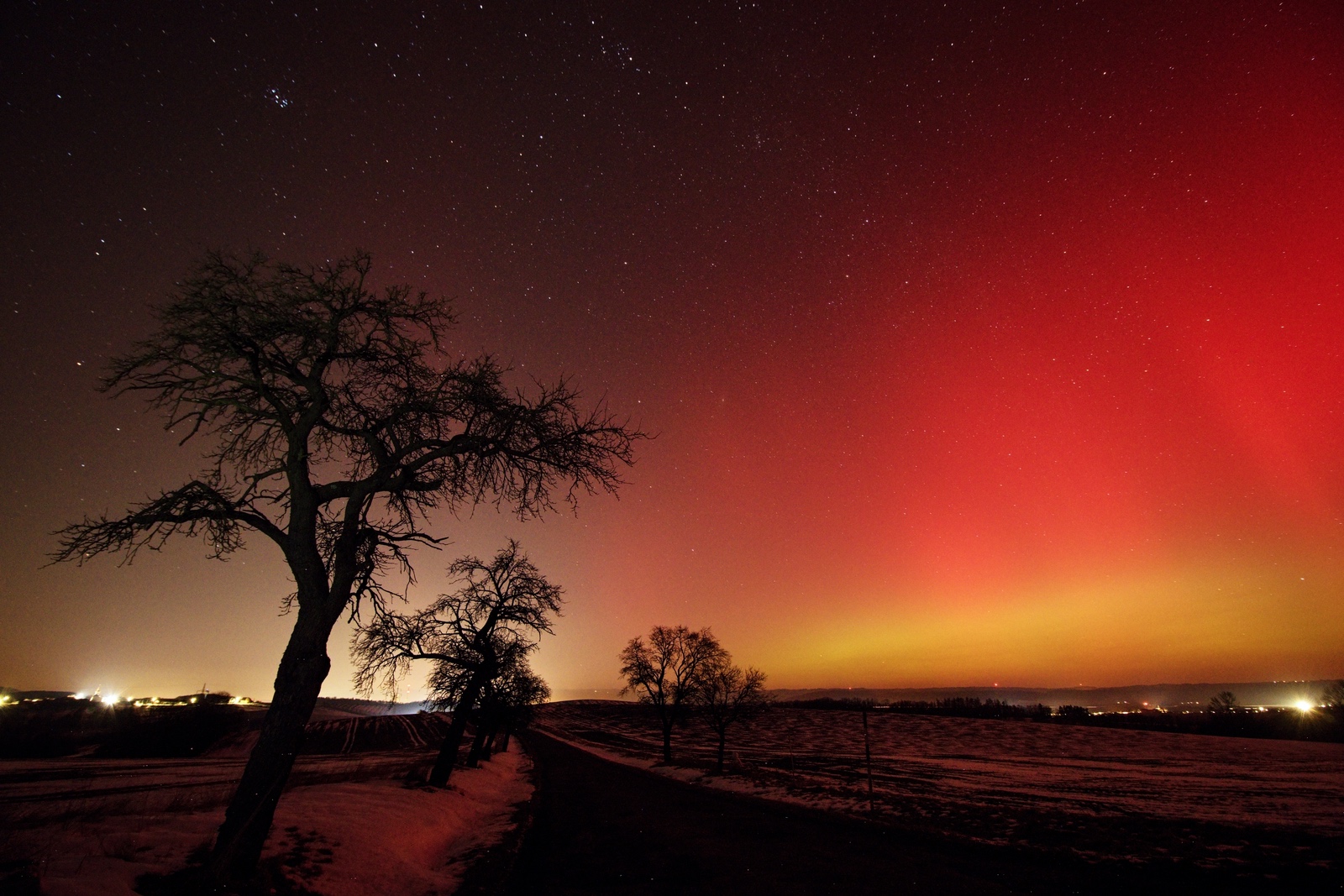 Když mi někdy kolem desáté večer zazvonil telefon a na něm Honza, divil jsem se, kvůli čemu může v tenhle nudný zimní den volat. Jak to řekl, chvíli jsem se zmateně divil, pak pokládám telefon a následovalo nejprve nějakých 10 minut stresu a nervů. Všechno rychle pobalit, dobře se obléknout, a rychle se dopravit na nějaké místo, odkud je vidět na sever. Jenže kolo mám píchlé, auto mělo zase zamrzlé okno zvenku i zevnitř. No nějak jsem dojel na své nové pozorovací místo, odkud jsem už před čtvrt rokem střelil svou kalendářovku. Vyškrábal jsem se po svahu, nainstaloval foťák a poprvé se podíval na oblohu. Opravdu – je tam! Obloha se ve výšce znatelně červenala a u země bylo vidět zelené světlo. Hned na to jsem se podíval na displeji. Neskutečné! Pravá polární záře – snad jako v Radostovicích.