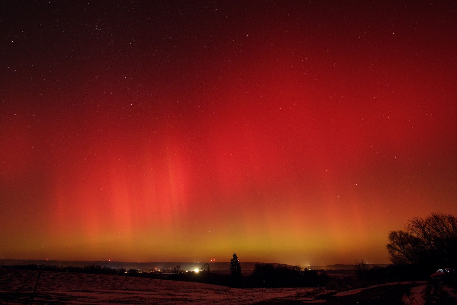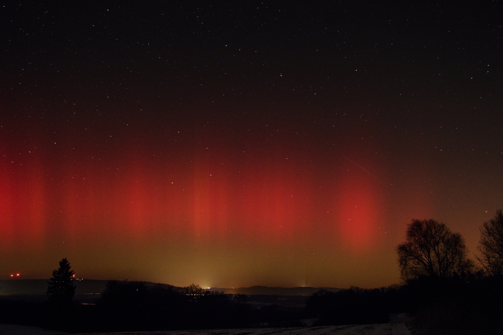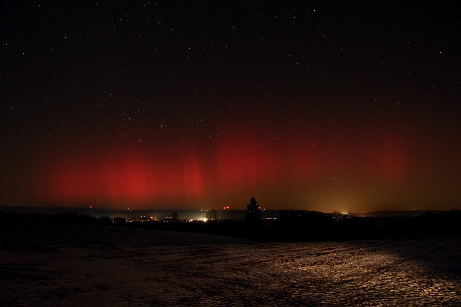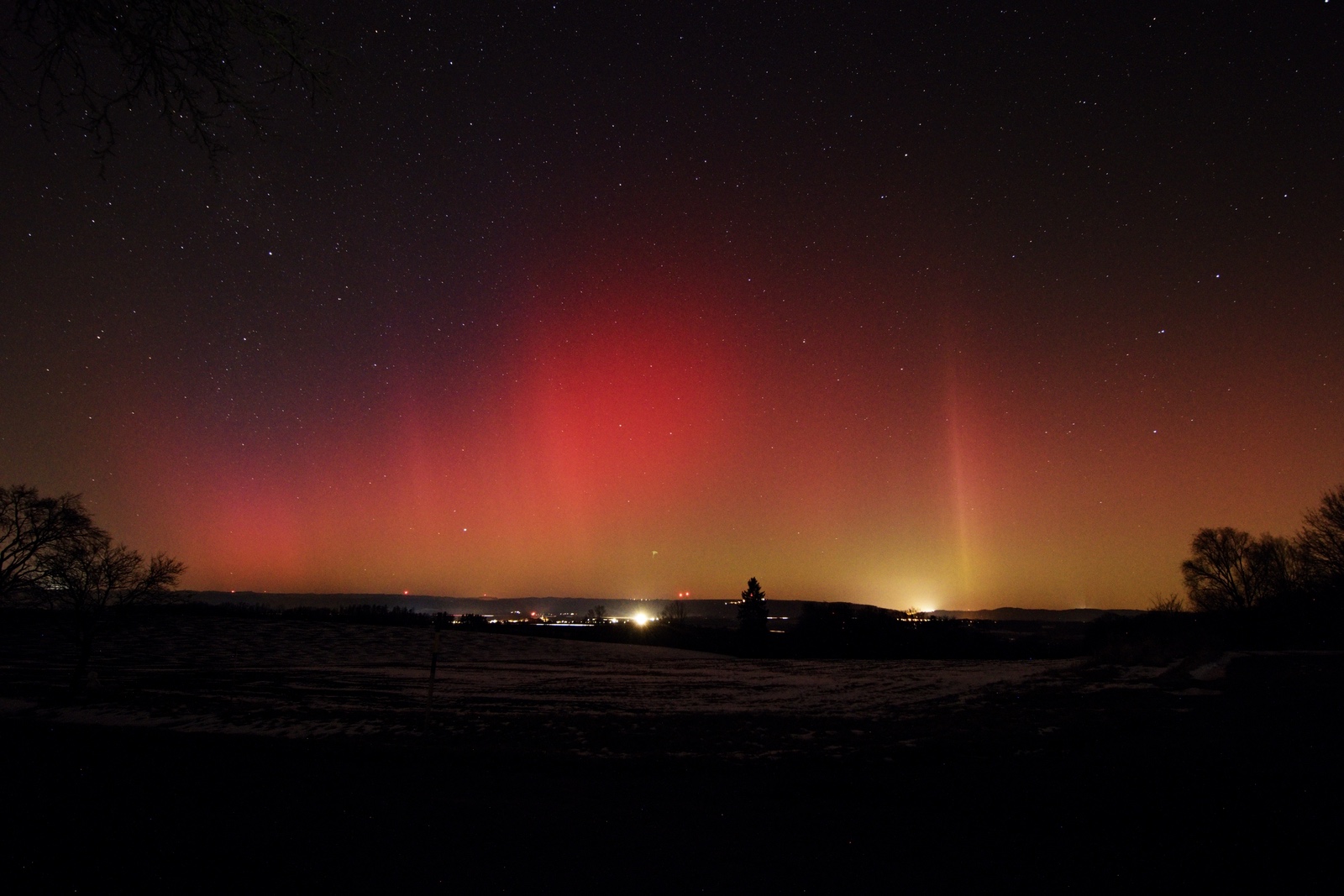 Rychle rozkládám stativ a pořizuji první snímky severní oblohy, na které tančí červené sloupy. Vybrali jsme si skvělé místo, protože nejjasnější je záře přesně v oblasti, kde nesvítí žádné velké město. Na SV výrazně svítí Nový Jičín, na západě pak Hranice a zejména lom tamní cementárny.