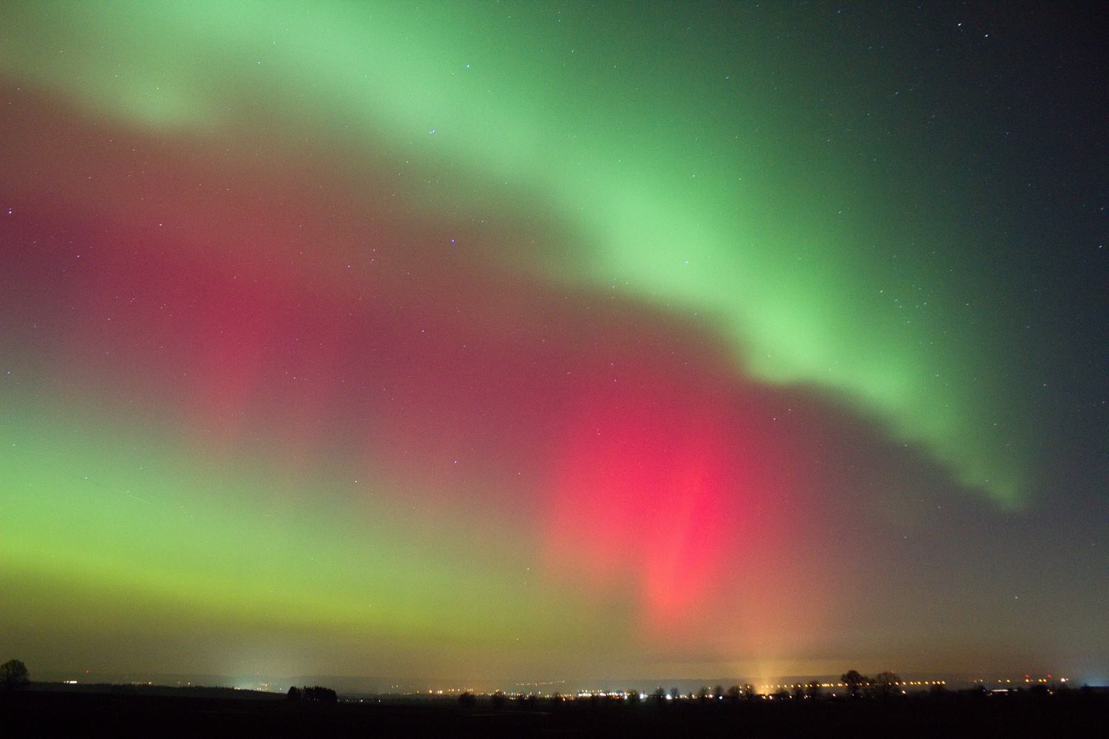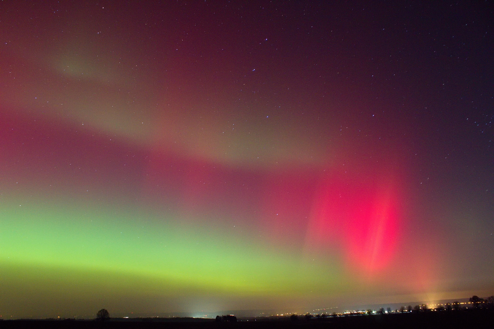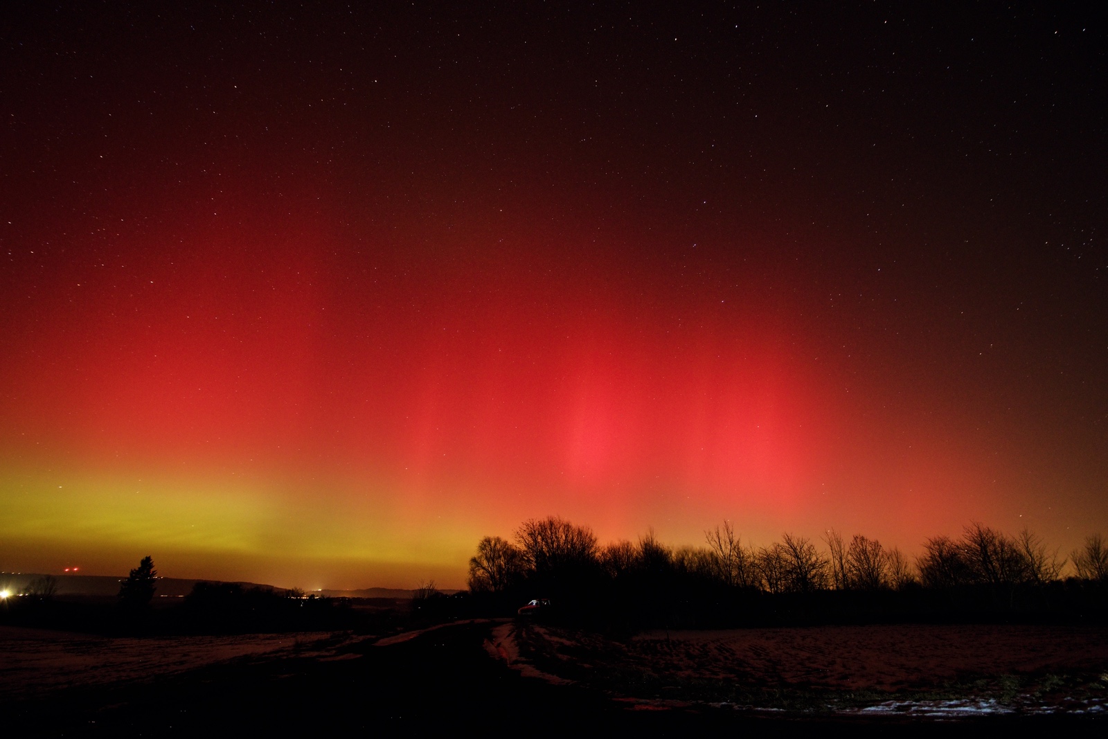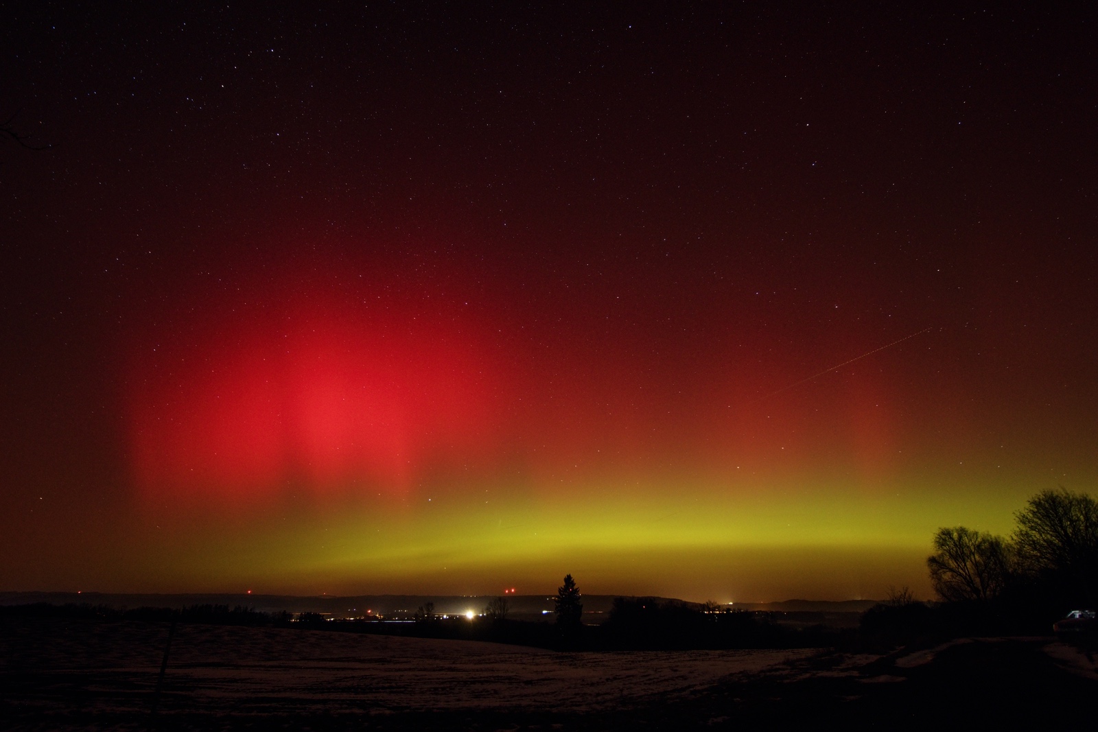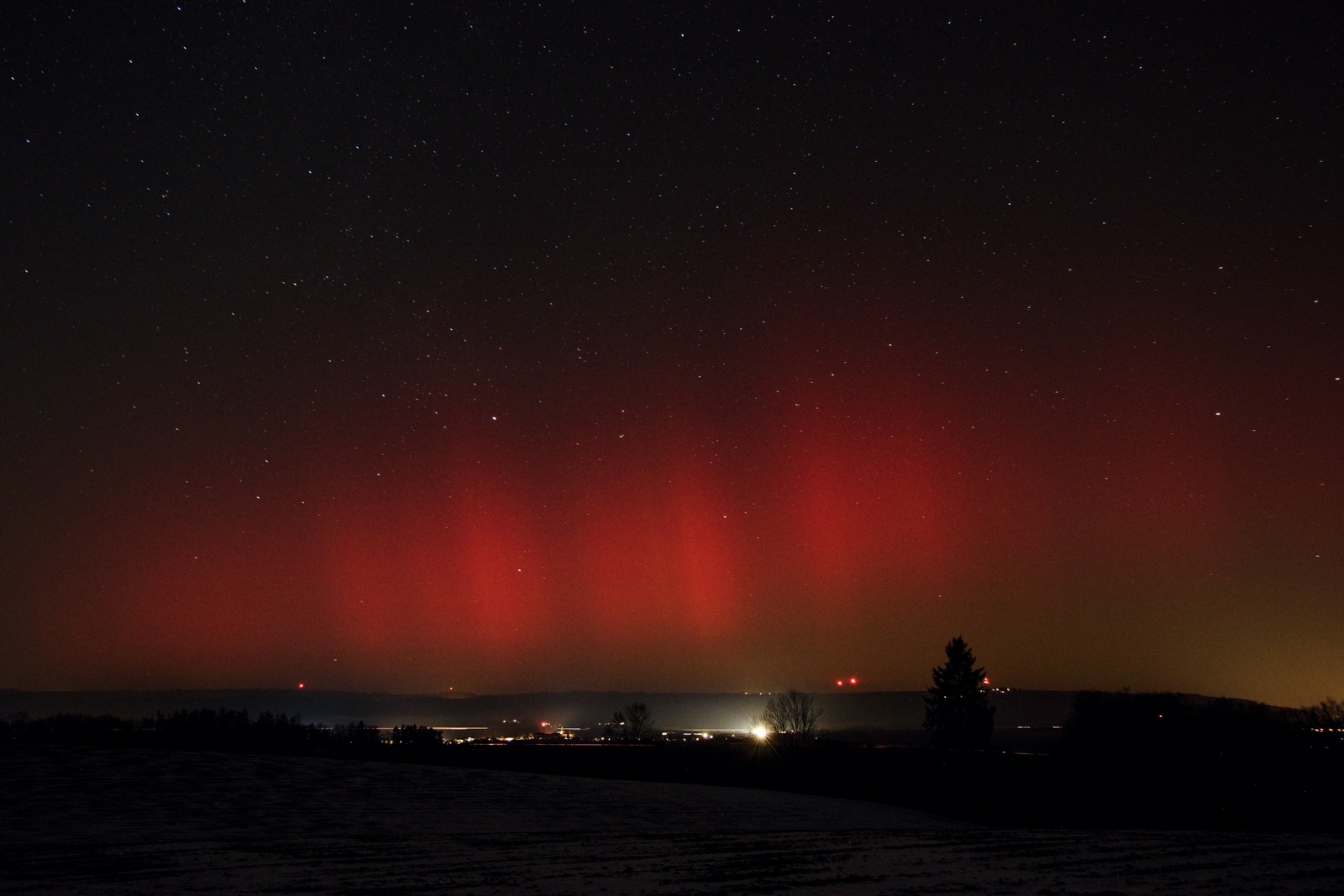 Rychle rozkládám stativ a pořizuji první snímky severní oblohy, na které tančí červené sloupy. Vybrali jsme si skvělé místo, protože nejjasnější je záře přesně v oblasti, kde nesvítí žádné velké město. Na SV výrazně svítí Nový Jičín, na západě pak Hranice a zejména lom tamní cementárny.
