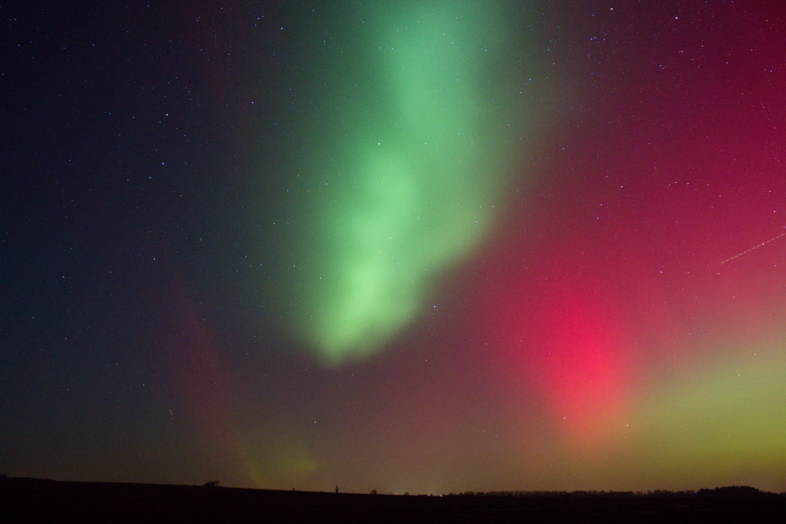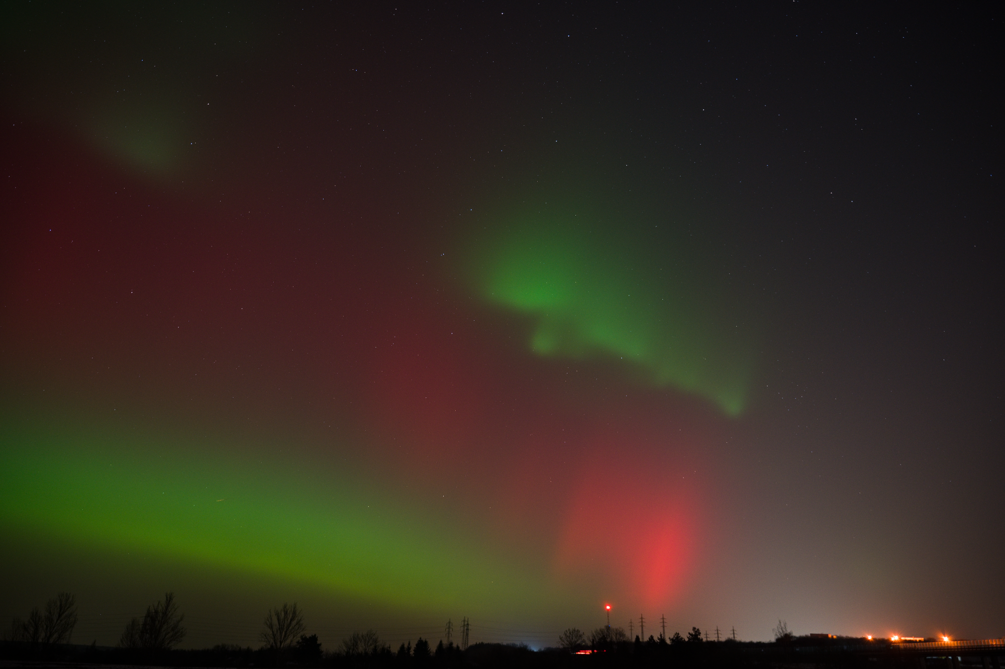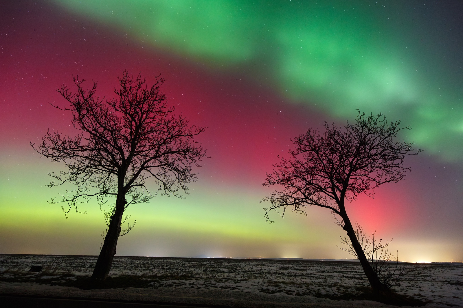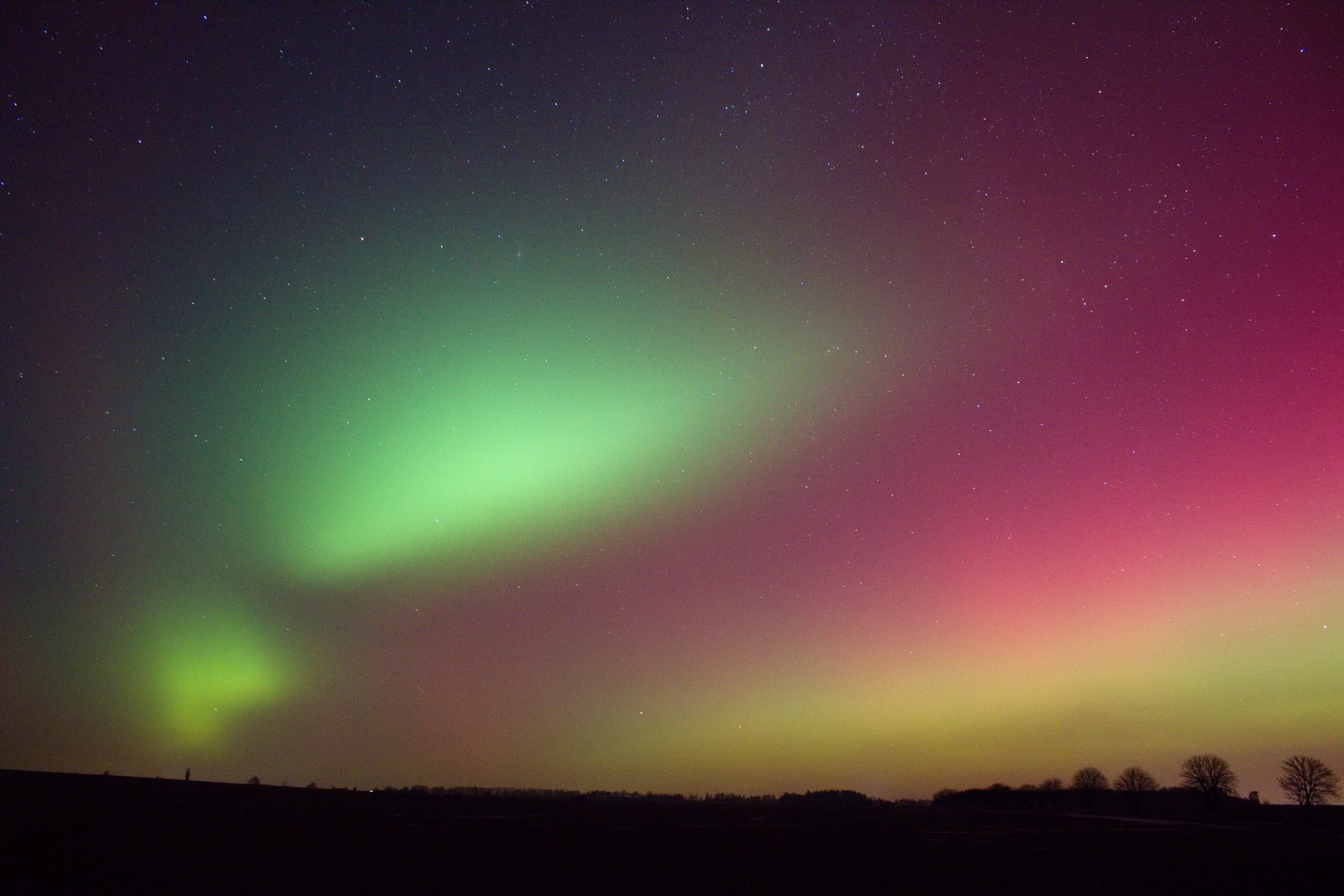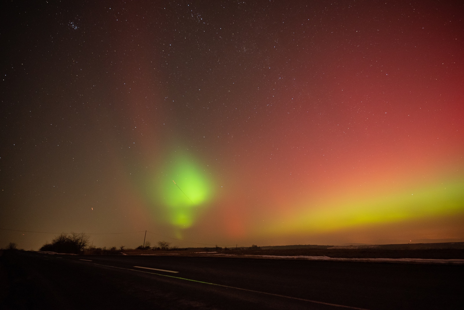 Už po příjezdu bylo patrné, že domů s prázdnou nepojedeme. Honem jsem rozbalila výbavu a udělala první průzkumnou fotku, ale už pouhýma očima jsem viděla, že tam ta červená je. Zatím hlavně na SZ. A kdyby jen červená, při horizontu to vypadá i na zelenou. Začali jsme pobíhat a hrát si se stromy kolem silnice, zatímco červená lezla stále výš a výš a celý sever se rozsvítil zelenou.