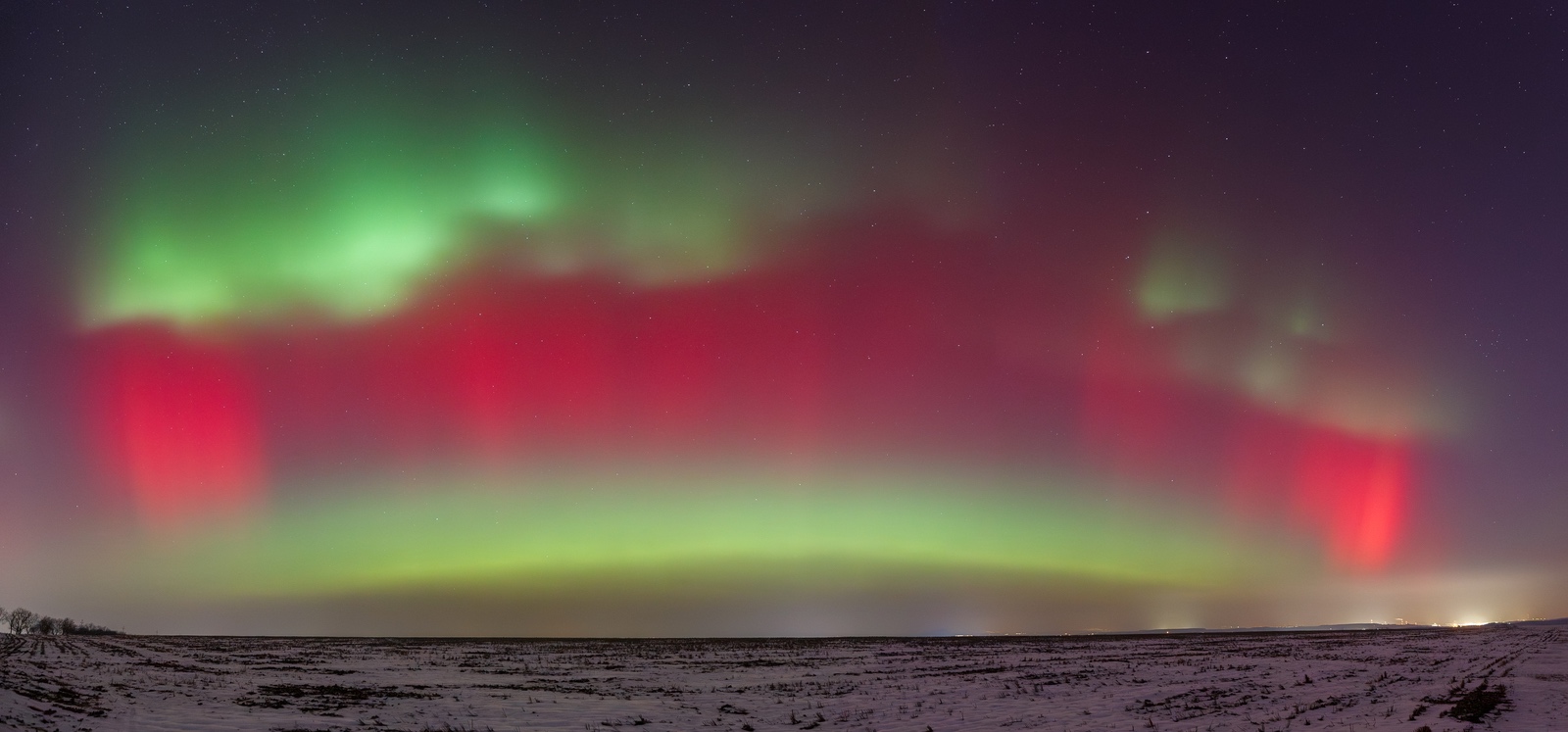 Poté se o slovo opět přihlásila “klasická” polární záře a to výraznými rudými sloupy, které vyšlehly ze zelené záře dole u obzoru, která však začala slábnout.
