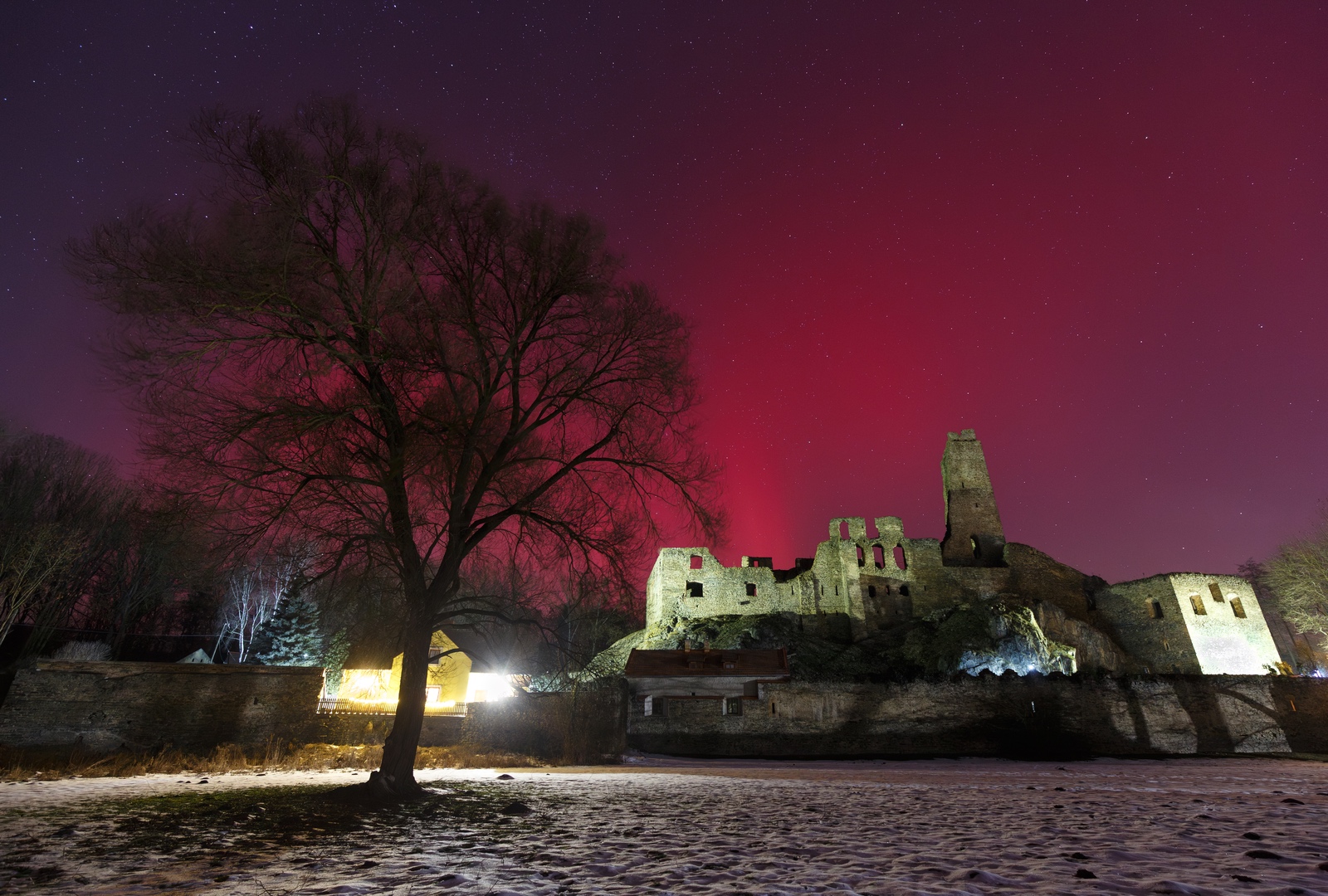 Zaparkovali jsme u závory zavřeného parkoviště a spěchali jsme na louku k hradu. Očima nic moc vidět nebylo, ale foťák odhalil hrad v rudé záři, za kterou by se nemuselo stydět ani Kladno. Chvíli jsme čekali na další zážeh, jako se to povedlo tenkrát v květnu, kdy po první várce přišla druhá a ještě lepší, ale to se tentokrát nestalo. Naopak sever úplně zhasnul, a tak jsme alespoň mohli v klidu vyrazit domů do tepla a do postele, protože nám už byla docela zima a také již bylo poměrně pozdě.