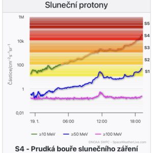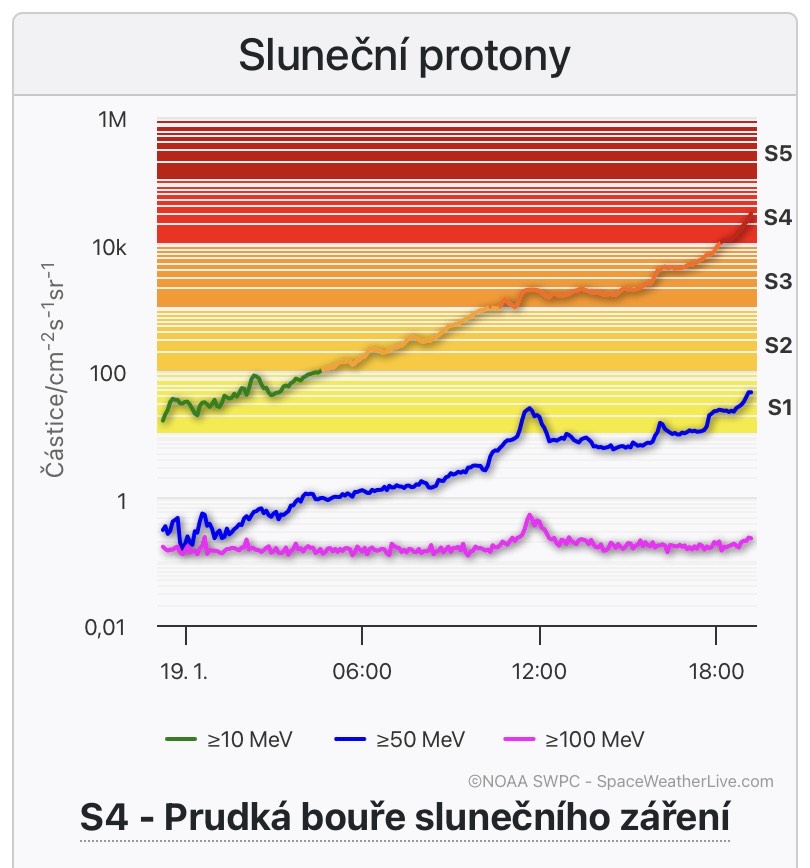 Večer, kolem osmé hodiny přichází rázová vlna, která stlačila plazma ze slunečního větru a hrnula ho před sebou. Jelikož obsahovalo velké množství protonů, tak se projevovalo i v rádiové oblasti silným rušením a také skokovým zvýšením radiace v okolí Země. Tomuto jevu se říká „protonová bouře“. Magnetické bouře mají G stupnici (G1 až G5), protonové S stupnici (S1 až S5). Tato byla neobyčejně silná a dosáhla druhého nejvyššího stupně, S4. Za nedlouho zareagovalo i magnetické pole naší planety Země a začaly se dít věci. Během několika (nižších desítek) minut i geomagnetická bouře dosáhla druhého nejvyššího stupně (G4) a zažehla se jasná polární záře. Psalo se 19. ledna 2026, čas 21:10 SEČ. (Všechny časy jsou uvedeny v SEČ)