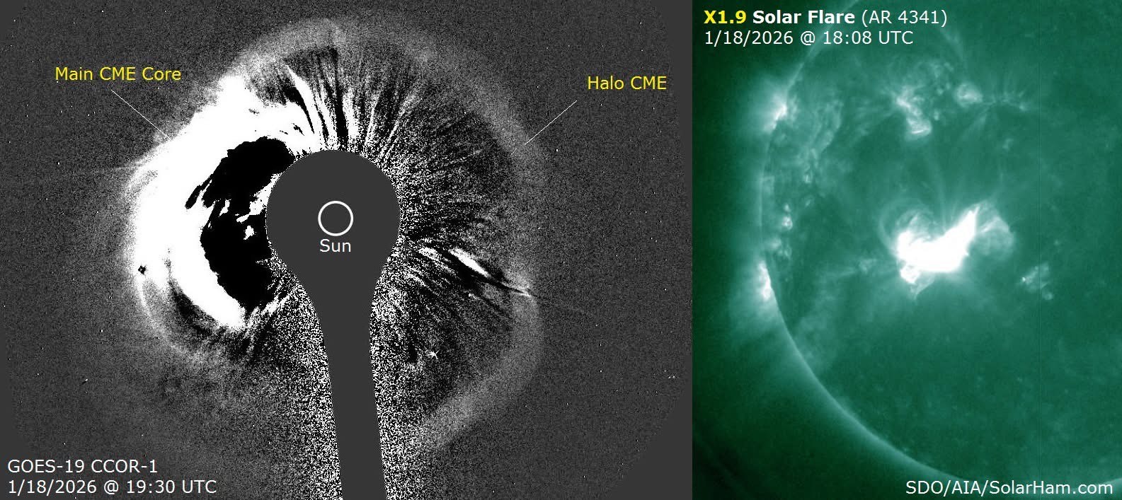 Dříve, než popíšu události mrazivého večera 19. ledna, je třeba se posunout o den zpět k dění na Slunci. Dne 18. ledna v 19:08 SEČ (18:08 UTC) došlo v aktivní oblasti označené AR4341 k rozsáhlé a silné erupci X1,9. “Běžné” erupce této třídy se projeví jako jasný záblesk v rentgenové oblasti spektra, tato však byla jiná, mnohem větší. Během ní se rozsvítila velká plocha na povrchu Slunce a bylo jasné, že vyvrhne velké množství materiálu. Zanedlouho se na obrázcích z koronografů objevila obří CME (Coronal Mass Ejection), tedy výron hmoty z koróny. Podle tvaru bylo jisté, že částečně trefí Zemi. Rychlost této CME byla úctyhodná, při příletu k Zemi stoupla rychlost slunečního větru až na 1200 km/s.